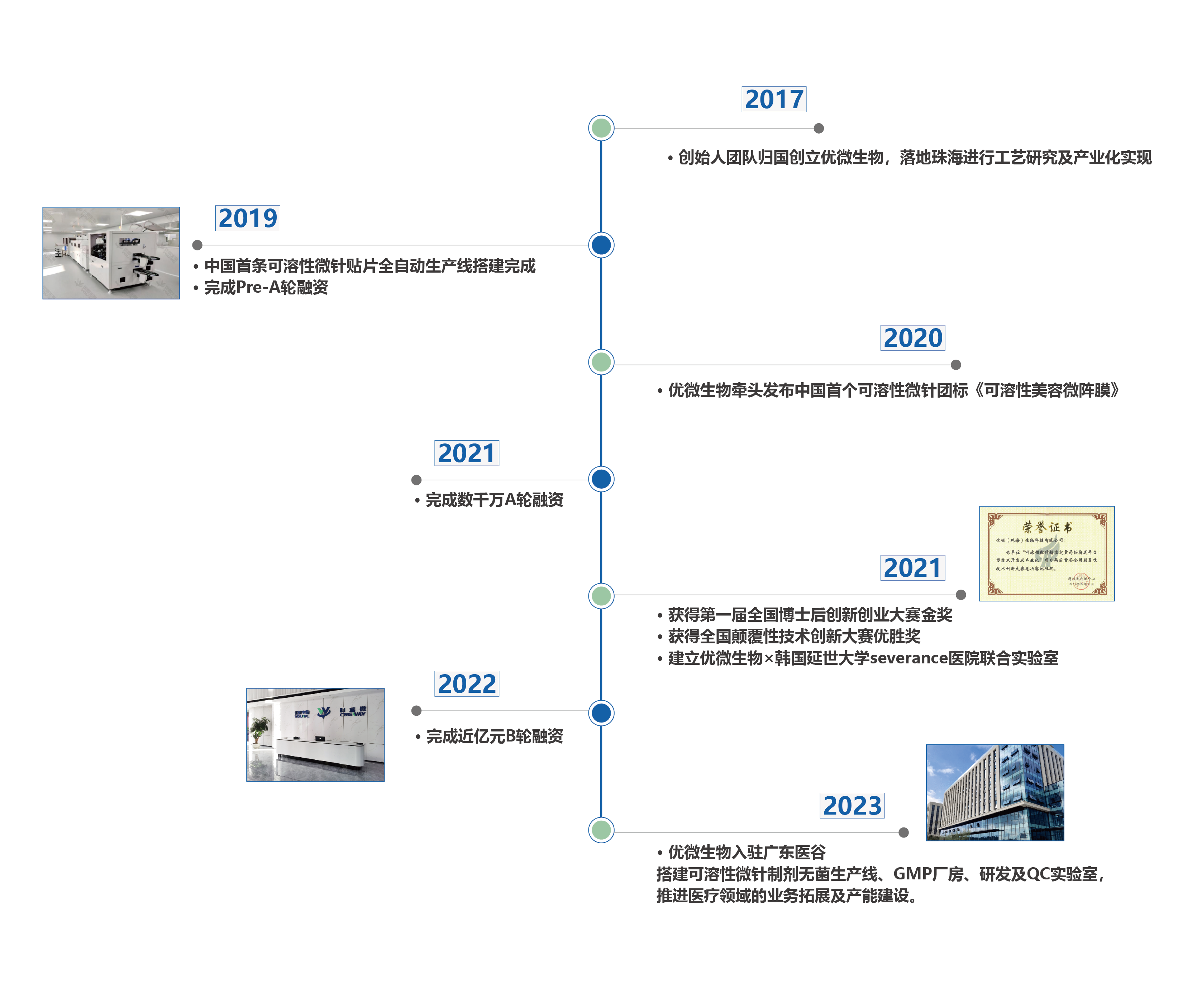 优微生物是一家专注于可溶性微针透皮给药技术研发及产业化发展的国家级高新技术企业,由3位韩国延世大学博士归国后于2017年2月创立,以多年的透皮给药工艺和配方研发经验、Know-how等为技术驱动,以自主创新研发的透皮给药贴剂全自动生产线为依托,应用自主创新的In CtrolRLS™微点阵成分控释技术、可溶性微针透皮给药技术等,开发具有副作用更小、疗效更优、患者顺应性更好的新型透皮给药制剂产品。可以为客户提供透皮给药新剂型研发、缓释类药物透皮给药解决方案、医美领域透皮吸收产品开发和生产。